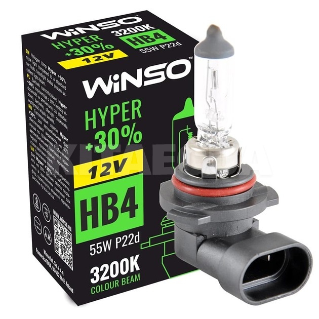 Это галогенная лампочка серии Hyper от бренда Winso, которая отличается превосходными характеристиками светового луча. Сила светового потока увеличена на 30%, по сравнению с лампами стандартной модификацией, что повышает безопасность при вождении в темное время суток, дорожные знаки больше видны, а также увеличена зона видимости периферийного зрения.
