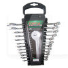 Набор комбинированных ключей Toptul GAAC1201 состоит из 12-ти инструментов которые, применяются для монтажа/демонтажа резьбовых соединений разной сложности. Данные ключи простые, прочные и функциональные, благодаря этому они повсеместно используется во всех сферах технического обслуживания и ремонта техники, включая автомастерские и СТО.Конструкция ключей включает головки двух типов, рожковую и накидную. Обе головки имеют одинаковый размер, что позволяет работать с одним и тем же крепежным элементом, с помощью той головки, которая более удобная в данный момент. Также наличие головок разных типов компенсирует недостатки каждой из них по отдельности.Для достижения максимального удобства при работе с крепежами, а особенно в труднодоступных местах, накидная головка развернута к оси под углом 15°. Также облегчает работу с труднодоступными резьбовыми элементами профиль накидной головки, так как 12-ти граннный профиль позволяет быстрее захватить гайку или болт.Ключи изготовлены из прочной хром-ванадиевой стали, которая характеризуется высокой твердостью, стойкостью к износу, деформации и повреждениям. А хромированное покрытие ключа обеспечивает защиту от коррозии и облегчает отмывание инструмента после работы.Набор поставляется в пластиковом держателе, который позволяет организованно хранить ключи.