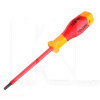 Стержень и рукоятка диэлектрической отвертки изготовлены по международному стандарту EN60900. Материалом стержня служит закаленная сталь S2. Для повышения износостойкости, увеличения жесткости и защиты от коррозии выполнено фосфатирование шлица. Изделие имеет сертификацию VDE/GS, что подтверждает его прочность, стойкость к высоким температурам и отсутствие в составе материалов вредных веществ. Эргономичная двухкомпонентная рукоятка с формой, отвечающей требованиям безопасности и отверстием для подвешивания, обеспечивает удобство эксплуатации инструмента.