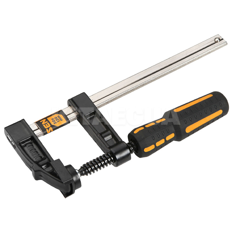 Конструкция состоит из основной рамы, губок в виде неподвижного и подвижного элемента с резьбовым стержнем, деревянной ручки. Материалом стержня служит сталь с фосфацией, губок - чугун с порошковым покрытием, рейки - никелированная сталь. Двухкомпонентная рукоятка обеспечивает удобную эксплуатацию инструмента.